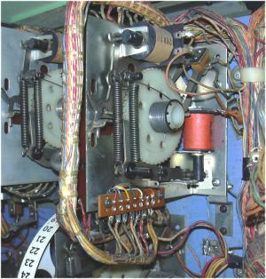 Home Stepper Repair:Stepper units in pinball machines are counters which maintain state like ball in play, bonus, or player up counters. Some steppers count up one and down one like a bonus stepper. Some count up one and and reset to zero like ball in play or player up steppers. Others simply count up in a loop like a match stepper which loops over and over. TAKE PHOTOS OF THE UNIT at each step in case you forget where something goes. Here is a Williams player up stepper unit. It's located in the back box and selects which player (1-4 in this case ) is currently up. The unit is responsible for routing scoring signals to the correct set of score reels. The problem with this reel was that it wouldn't select the correct player. The springs were over tightened as shown in the photo. You can verify operation with the power off by manually pushing the solenoid plungers in and watching the stepping action. It should count up smoothly and reset properly and fully to the home position. One solenoid counts up, the other one resets the stepper. Note the spring adjustment: