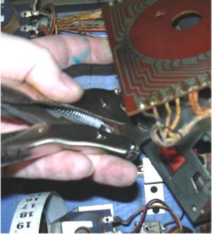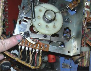 Remove the center screw on the circuit side will allow you to remove the contact fingers. Hold the white plastic gear on the opposite side of the assembly to prevent it from popping out. Note the alignment of this gear and the spring tension.