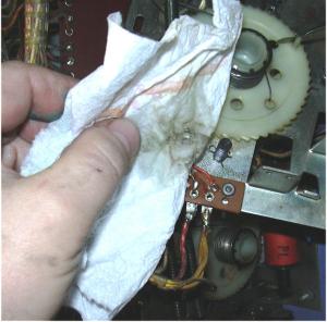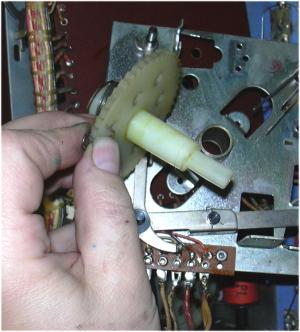 Remove the nylon gear. This will just pull up through the stepper chassis. The spring will loosen unless you secure it. Note the yellow gunk on the armature. Again, clean this with WD-40 and remove all residue. Also clean the inside of the armature guide in the stepper housing. Re-assemble everything and verify alignments and spring tension. While you're hear it's a good idea to clean the EOS contact switch blades with a file or fleckstone.
