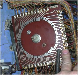 The stepper now moves smoothly without the contact fingers attached. Good. Next, re-solder the wire connections to the pcb. These are prone to loosen through expansion/contraction over the years and could create a hard to find intermittent problem. Resoldering all the connections will insure proper performance. While you're at it clean the disk. Again, wipe down with WD-40 and clean of all residue. Note the burn marks. These are cause by the mis-alignment of the contact fingers. These may require sanding to smooth out the pcb otherwise the burrs will cause the fingers to wear and and cause them to misalign themselves.
